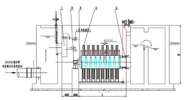 一、纖維轉盤濾池|纖維轉盤過濾器概述 纖維轉盤濾池|纖維轉盤過濾器是我公司自主研發(fā)的一項過濾技術。其主要原理是,當污水進入反應槽后,轉盤交替地和空氣與污水相互接觸。在經(jīng)歷過一段時間后,在轉盤上即將附著一層棲息著大量生物的生物膜,微生物的種屬組成逐漸穩(wěn)定,其新陳代謝功能也逐步發(fā)揮出來,并逐漸達到穩(wěn)定的程度,污水中的有機物為生物膜所吸附和降解。 二、纖維轉盤的過濾介質 纖維轉盤濾池|纖維轉盤過濾器的過濾質是纖維毛濾布,它的主要成分是有機纖維堆,其絨毛表面由50%超細聚酯纖維和50%改性丙烯晴纖維堆組成,同時以聚酯纖維作為支撐體。在干燥狀態(tài)下,纖維毛呈直立狀態(tài),浸濕后纖維毛便會耷拉下來,形成濾布介質有3-5mm的有效過濾深度,且當量孔徑只有10μm ,可以使固體粒子在有效過濾厚度中與過濾介質充分接觸,在反沖洗狀態(tài)下,與反抽裝置相靠近的纖維毛又會直立起來,方便纖維毛中的雜質排出,可以徹底清洗。纖維毛在各種狀態(tài)下的情況如圖所示: 三、纖維轉盤濾池|纖維轉盤過濾器的結構 纖維轉盤濾池|纖維轉盤過濾器結構如下圖所示,它由用于支撐濾布的垂直安裝于中央集水管的平行過濾轉盤串聯(lián)起來組成。一套裝置過濾轉盤數(shù)量-般為2-20個 ,每個過濾轉盤是由6個小塊扇形組合而成。過濾轉盤由防腐材料組成, 每片過濾轉盤外包有纖維毛濾布。反沖洗裝置反抽吸裝置及閥門組成。排泥裝置由排泥管、排泥泵及閥門]組成,排泥泵與反洗水泵為同一泵。 四、纖維轉盤濾池|纖維轉盤過濾器的運行 纖維轉盤濾池|纖維轉盤過濾器的運行狀態(tài)包括:過濾、反沖洗、排泥狀態(tài)。 (1)過濾:外進內(nèi)出,污水重力流進入濾機體,使濾盤全部浸沒在污水中。同時為了使各處布水均勻并且使進水量產(chǎn)生低擾動,須在濾機中設布水堰。污水通過濾布過濾,過濾液通過中空管收集后, 流入出水槽、堰排出濾機。整個運行過程中過濾均為連續(xù)的,即便在清洗過程中,過濾仍在進行。 (2)清洗:過濾中部分污泥吸附于纖維毛濾布中,逐漸成為污泥層。隨著濾布上污泥的積聚,濾布過濾阻力增加, 濾池水位逐漸升高。通過設置在濾池內(nèi)的液位傳感器監(jiān)測池內(nèi)的液位變化,當該池內(nèi)液位到達清洗設定值時(高水位),控制盤即啟動反沖洗泵,同時啟動濾盤旋轉,開始清洗過程。反洗時間和周期可以調整。 (3)排泥:纖維轉盤濾池|纖維轉盤過濾器轉盤下設有斗型池底,有利于池底污泥收集。池底污泥沉積減少了濾布上的污泥量,可延長過濾時間,減少反沖洗水量。經(jīng)過一設定的時間段,控制盤啟動排泥泵,通過池底穿孔排泥管、閥、泵將污泥排至污泥系統(tǒng)。其中,排泥間隔時間及排泥歷時可以調整。 五、纖維轉盤濾池|纖維轉盤過濾器的獨特設計和優(yōu)點: (1)出水水質好,耐沖擊負荷高; 纖維轉盤濾池|纖維轉盤過濾器截留效果好,在進水SS不大于20mg/l時,出水SS可以小于5mg/l。 (2)占地面積小; 與傳統(tǒng)的深層過濾單元不同的是:傳統(tǒng)過濾設備內(nèi)水流一般從上至下,或從下至上,屬于平面方向過濾,纖維轉盤過濾器則將過濾面豎直起來,水流從左至右流動,因此很多過濾面可以并排布置,可以在保證過濾面積足夠大的前提下減少占地面積。另外,設備簡單緊湊,附屬設備少,根據(jù)布置情況,附屬設備只需占用少量地方。 (3)設備閑置率低,總裝功率低; 所有濾盤幾乎總處于過濾狀態(tài),設備閑置率低。整個過濾裝置需要用電的只有驅動電機、反洗水泵和電動閥,驅動電機功率僅為0.55KW-0.75KW,反洗水泵功率僅為2.2KW,總裝機功率很低 (4)反沖洗量水少,對前面處理工藝影響小; 纖維轉盤過濾器所需要的水量小,與處理水量的比為≤1%。實際工程運行情況下,反沖洗間隔時間一般為2h,每個濾盤的沖洗時間為1-2mim。因此,反洗水量可以比較均勻地返回到處理前處理系統(tǒng),不會對前處理工藝產(chǎn)生影響。 (5)清洗徹底,無需預加氯; 濾布結構為大孔隙支撐層及纖維毛層,反抽吸時,在反抽吸口處纖維毛會完全直立起來,清洗比較徹底,殘留很難積累。 (6 )運行自動化; 整個過程用計算機控制,可根據(jù)液位或時間來控制反沖洗過程及排泥過程的時間間隔及過程歷時。 ( 7 )維護簡單方便; 纖維轉盤濾池|纖維轉盤過濾器只有反沖洗或排泥時,泵或電機才運轉。濾布磨損較小,即使有異常損壞,濾盤也易于更換,濾盤的每個扇形片均可以單獨移開,更換一個盤片僅需10min。 六、纖維轉盤濾池|纖維轉盤過濾器設備安裝與土建尺寸